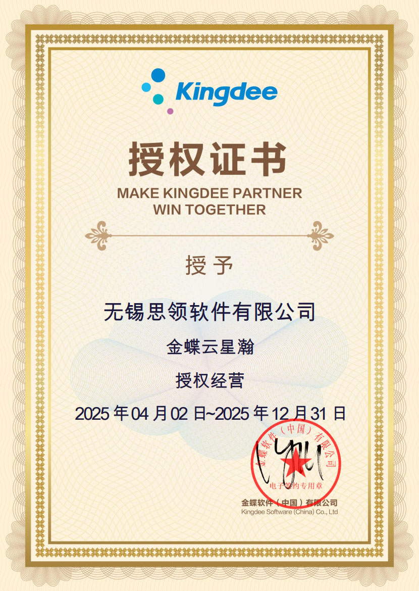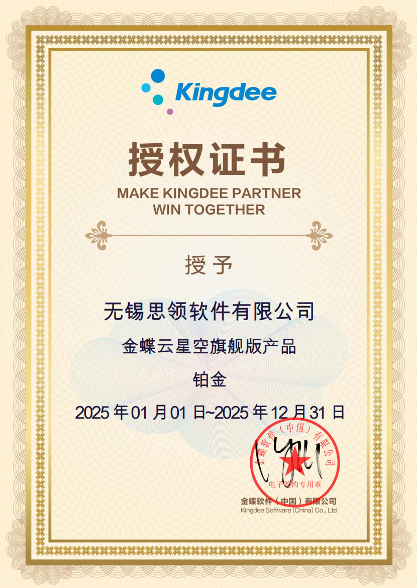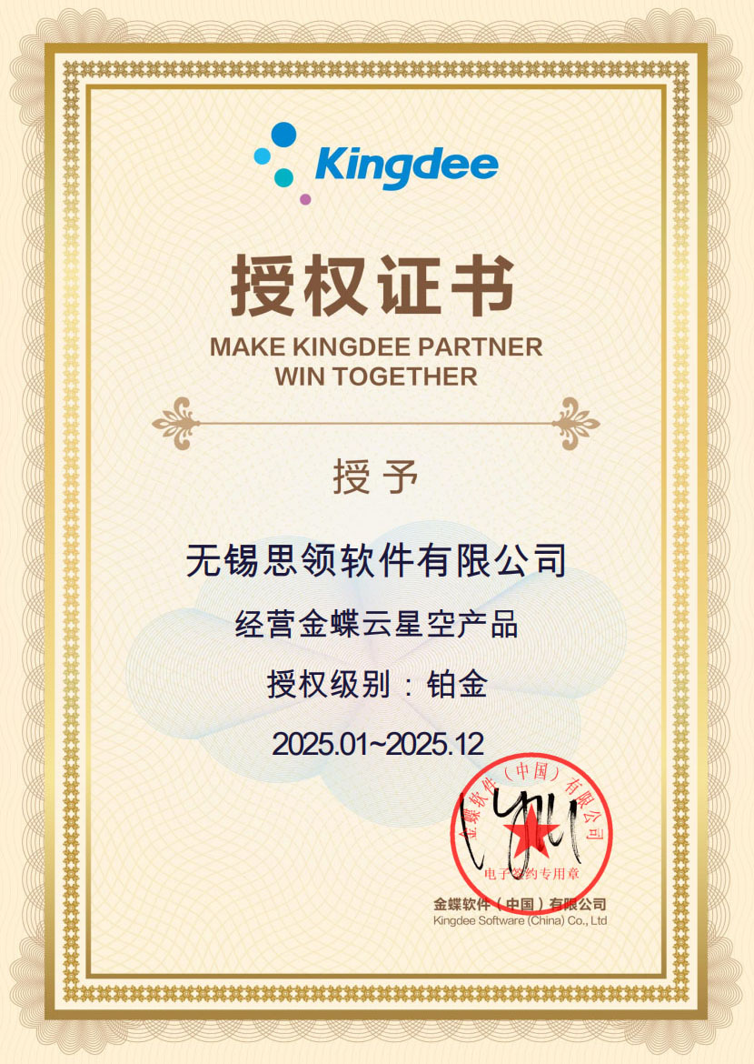 作为金蝶授权的铂金合作伙伴,无锡思领连续多年荣获“金蝶云星空精英伙伴”称号,业绩位居江苏省第一,具备强大的产品交付与服务体系。